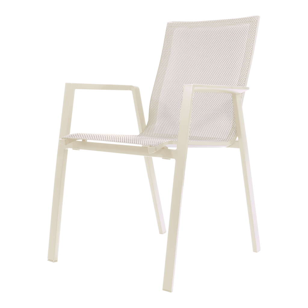 De Lesli living Tarragona crema stapelstoel. Deze stoel is gemaakt van gepoedercoat aluminium, heeft een teakhouten armlegger en een textileen zitting en rugleuning. Deze stapelstoel is weersbestendig en onderhoudsvriendelijk.