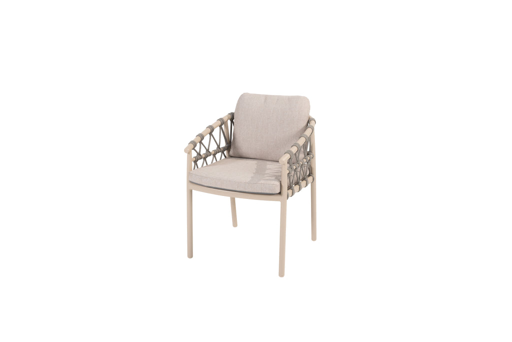 De 4 Seasons Outdoor Piacenza latte - Manolo is een retro diningset voor op uw terras. Deze diningset bestaat uit een aluminium diningstoel piacenza met een prachtige afwerking van rope, geleverd met zit en rugkussen. De tuintafel manolo heeft een aluminium onderstel en het tafelblad is gemaakt van geprint keramiek voor een solide uitstraling.