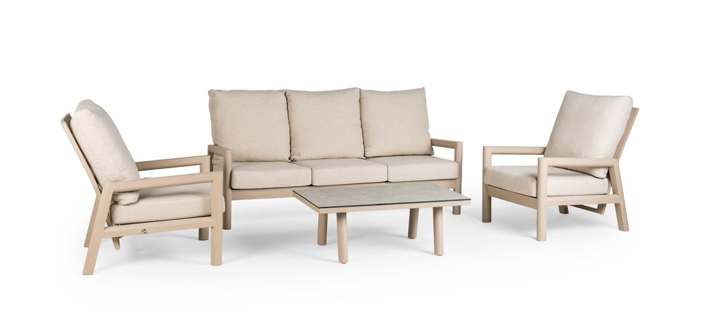 De Tierra Outdoor Sevilla Loungeset is een moderne Loungeset. Deze loungeset is gemaakt van gepoedercoat aluminium in de kleur champagne. De sevilla lounge tafel is afgewerkt met een hpl blad in de kleur ophira. Deze loungeset leveren wij met goed gevulde zit- en rugkussens, de kussens zijn afritsbaar en koud te wassen. De kussens zijn gemaakt van hoogwaardige kwaliteit, waardoor ze het gehele seizoen buiten kunnen liggen.